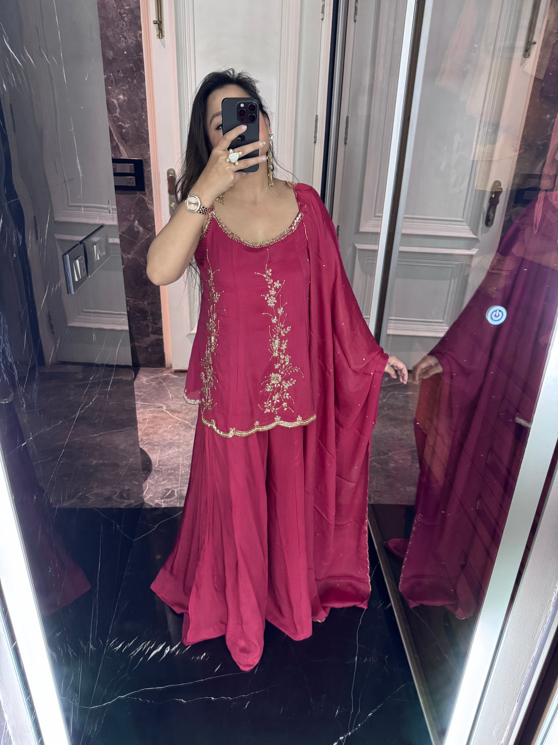 Rust sharara suit pehenne ke baad bahut graceful feel aata hai fabric comfortable hai aur long time tak pehen sakte ho