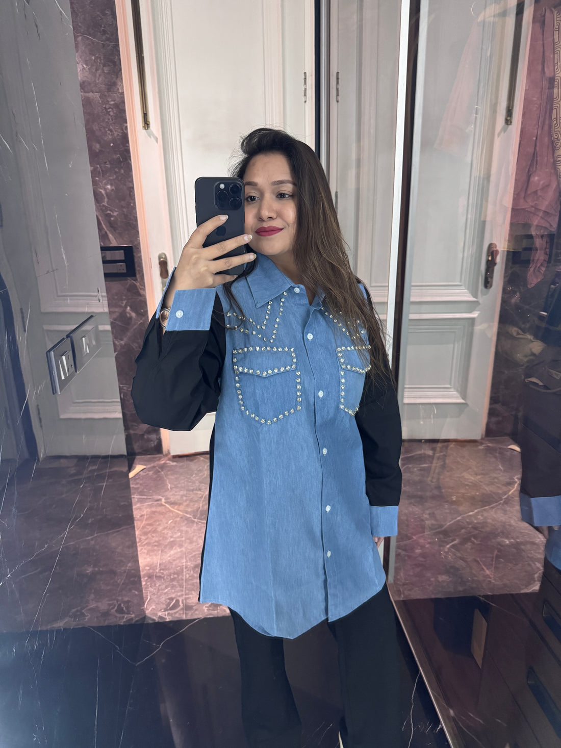 Stay effortlessly chic in this rhinestone-embellished cotton denim coord set, designed for easy summer styling....