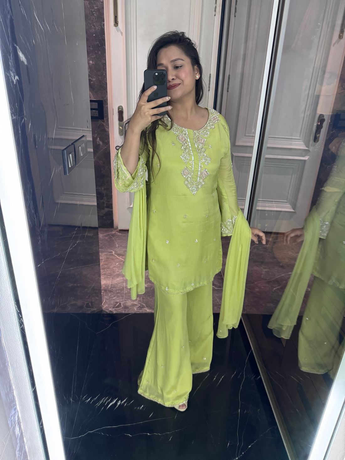 The Chinon sharara suit exudes an air of refined elegance, featuring exquisite handwork detailing on...