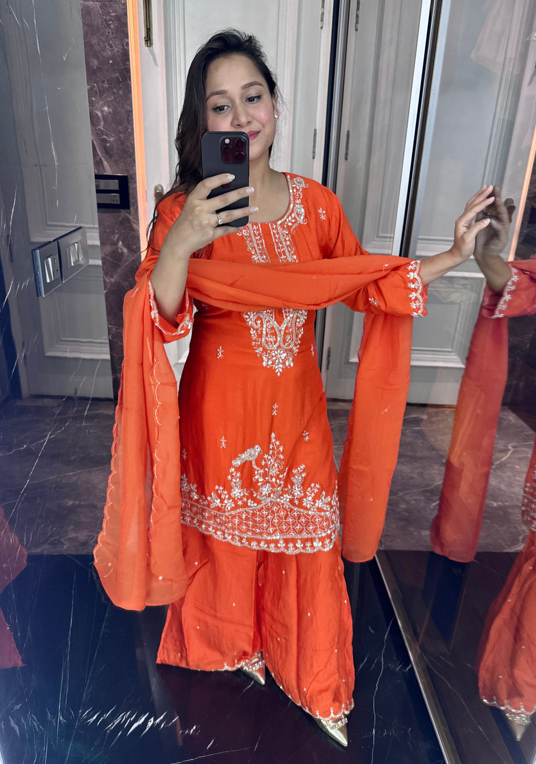 Celebrate in style with this stunning orange sharara suit, perfect for festive occasions and special...