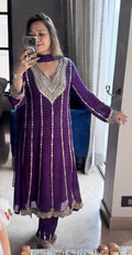 Experience the pinnacle of festive elegance with this stunning Chinon Anarkali suit, adorned with intricate all-over hand embroidery that showcases masterful craftsmanship. The luxurious Chinon fabric drapes beautifully, creating a graceful silhouette enhanced by elaborate detailing across the entire garment. Each stitch reflects meticulous artistry, making this piece a true statement of refined sophistication. Perfect for weddings, celebrations, and momentous occasions, this Anarkali suit embodies the grandeur of traditional Indian couture with an air of timeless elegance.