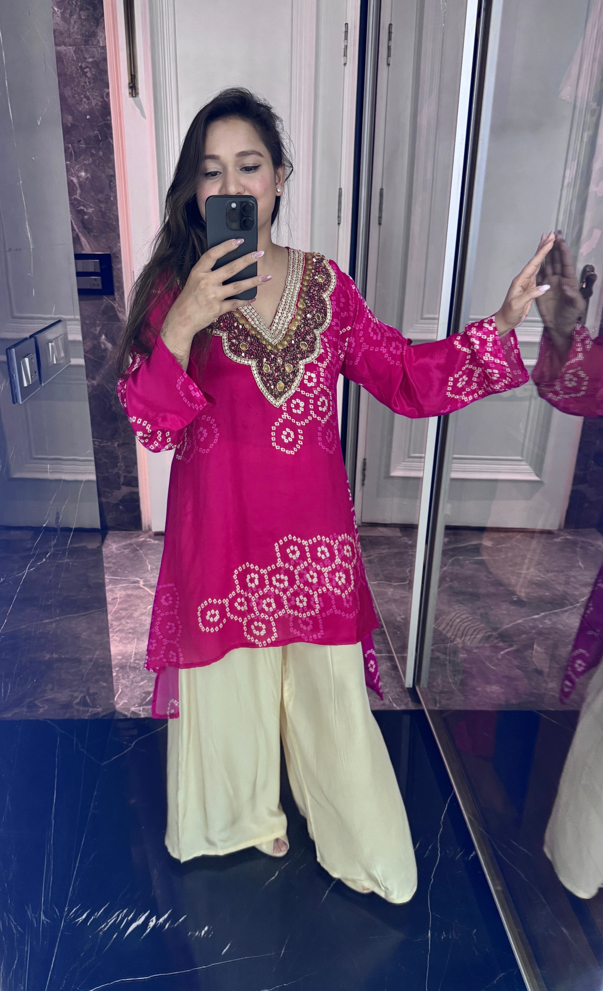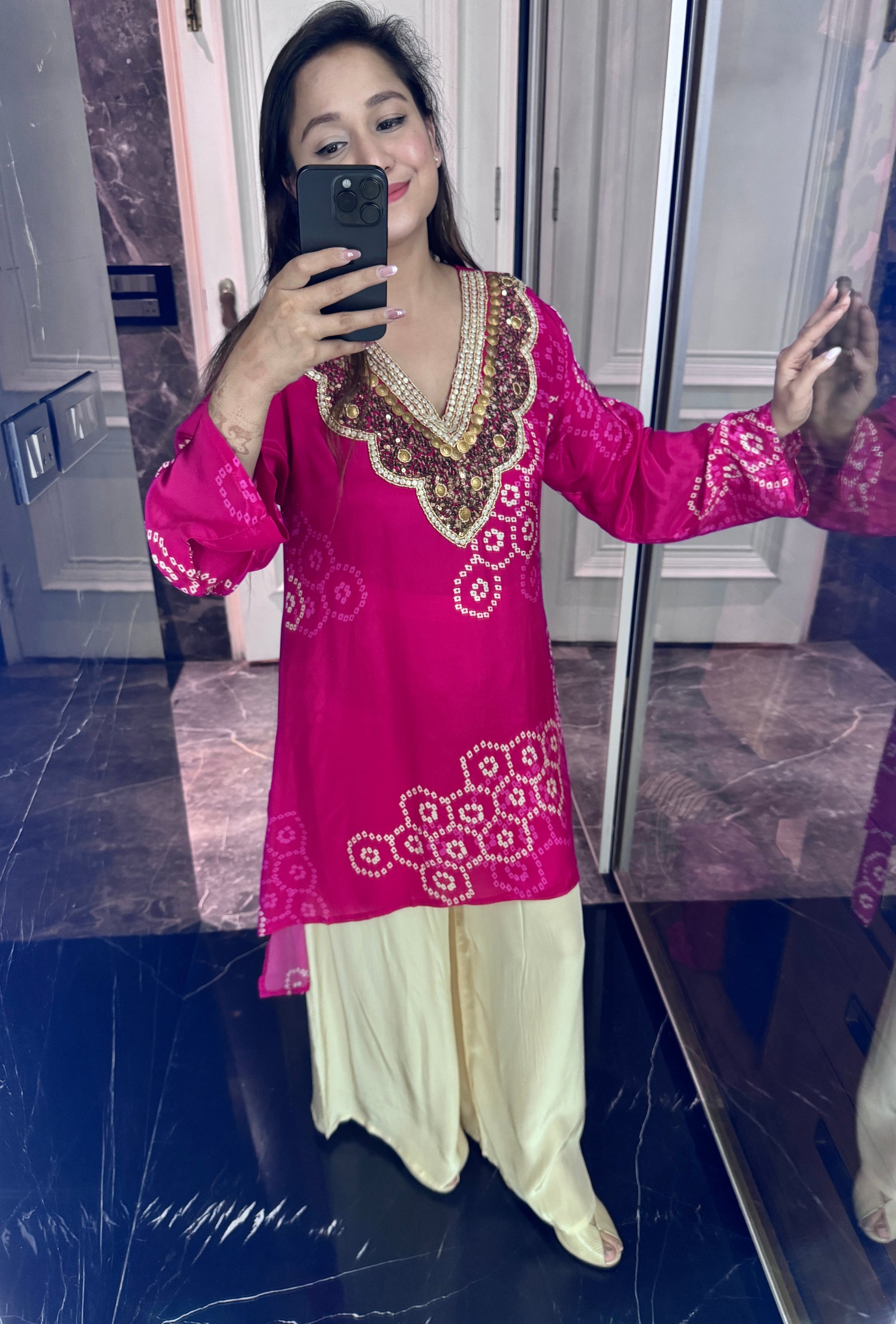 This elegant Bandhej print coord set brings together traditional craftsmanship and modern comfort. Made from lightweight crepe fabric, it features beautiful tie-dye patterns enhanced with detailed hand embroidery work. The coordinated set is designed for versatility—wear it to celebrations, family gatherings, or dress it down for casual occasions.