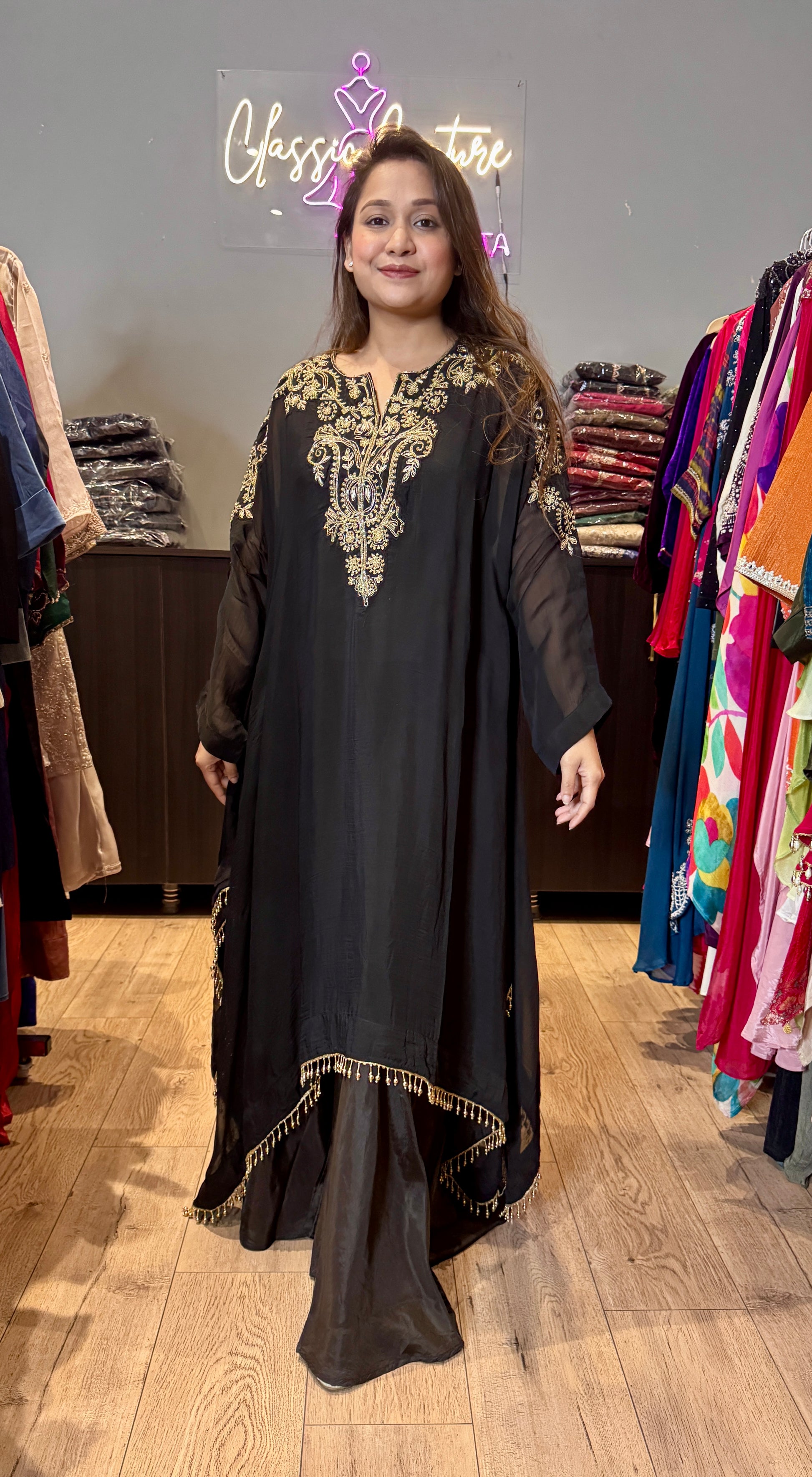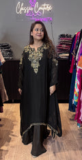 The Black Chogha Set is crafted from rich tissue organza, featuring intricate heavy handwork with pearl lace detailing. Its relaxed fit makes it suitable for elegant occasions such as ghazal nights and cocktail parties. The luxurious fabric ensures both comfort and sophistication, enhancing the wearer's overall aesthetic.