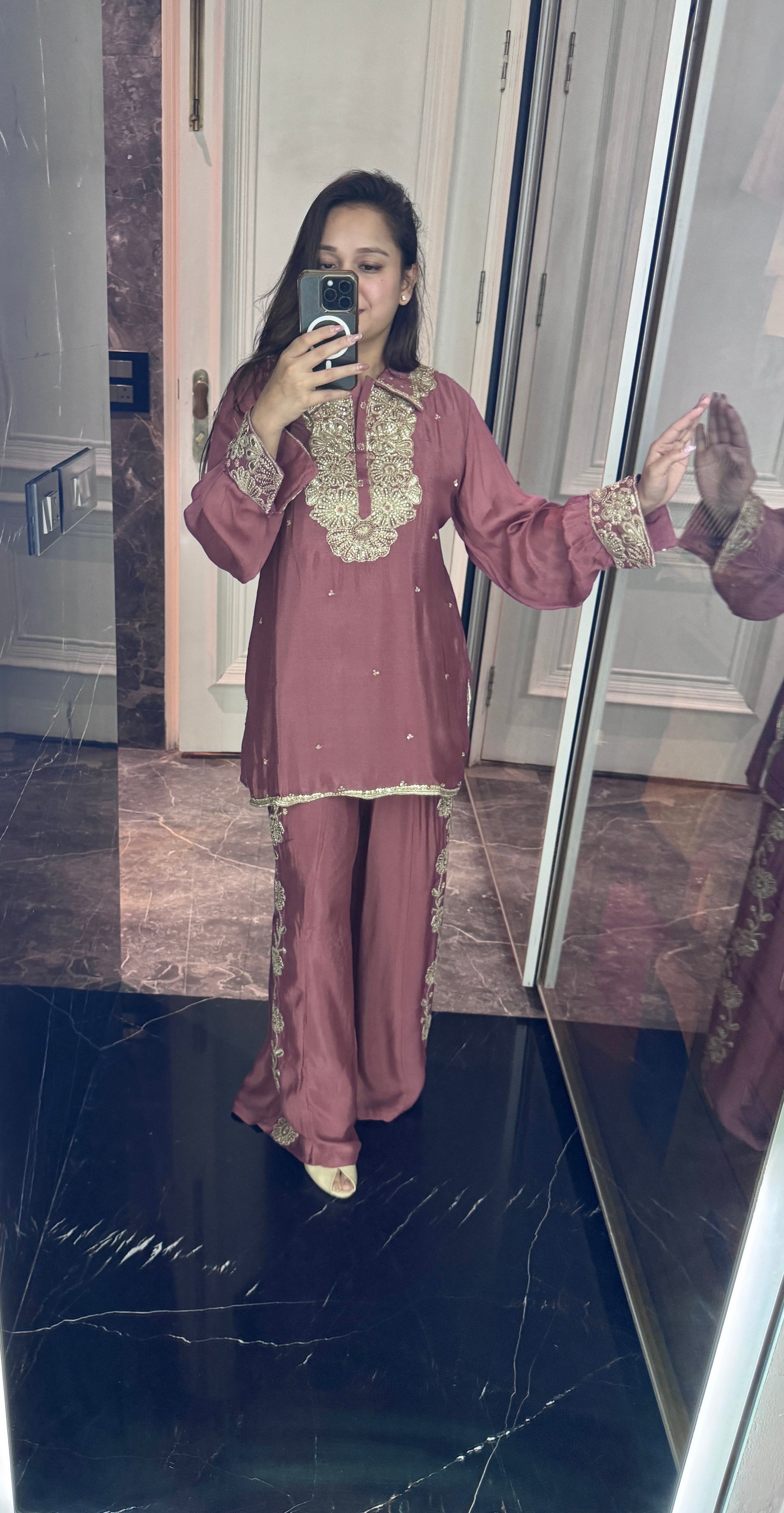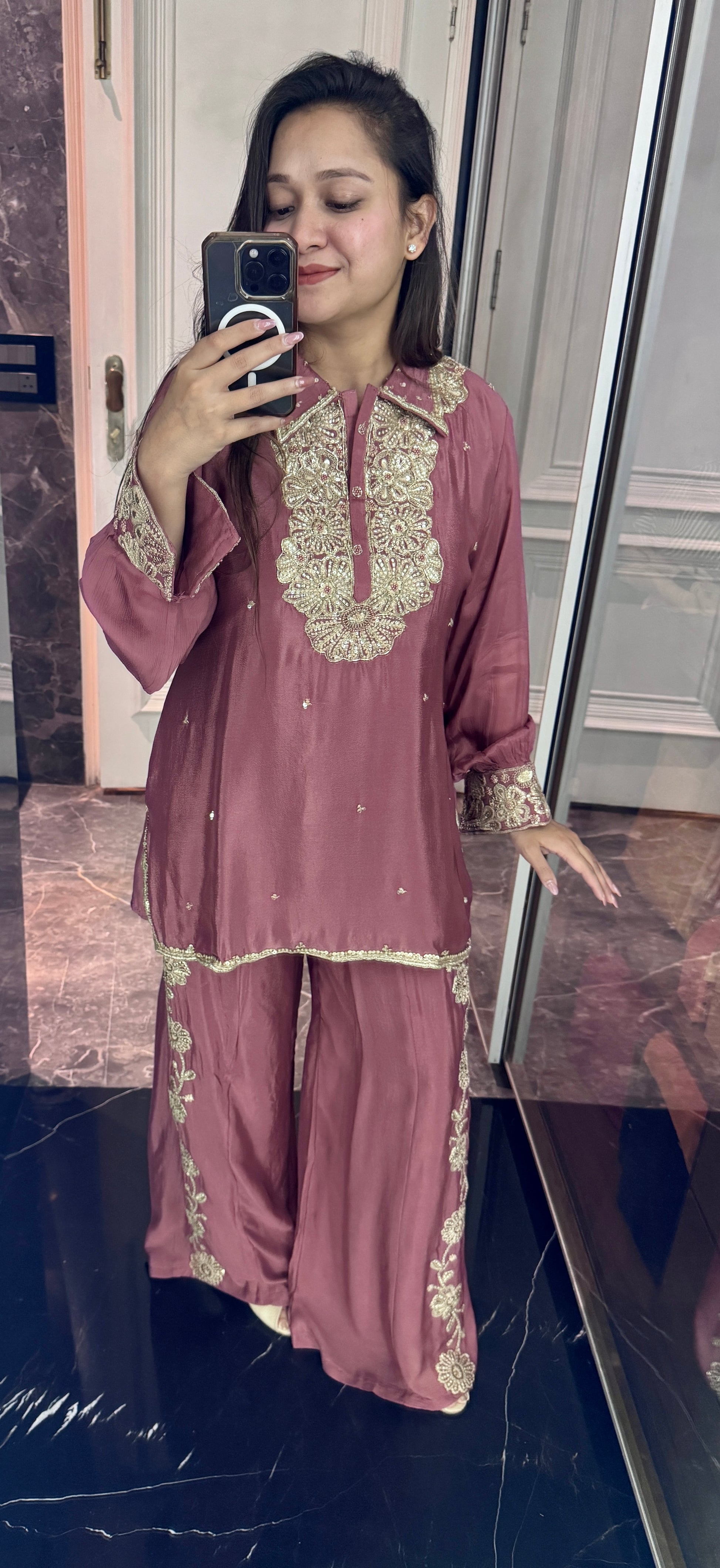 Elevate your ethnic wardrobe with this exquisite Chinon embroidery neck collar coord set. Crafted from premium Chinon fabric, this ensemble features intricate embroidered detailing at the neckline that adds refined elegance to your look. The coordinated set offers versatile styling options, perfect for festive occasions, celebrations, or elevated everyday wear. The delicate embroidery work showcases traditional craftsmanship while the sophisticated silhouette ensures a polished appearance. An ideal choice for those who appreciate timeless design with contemporary appeal.