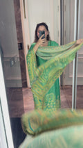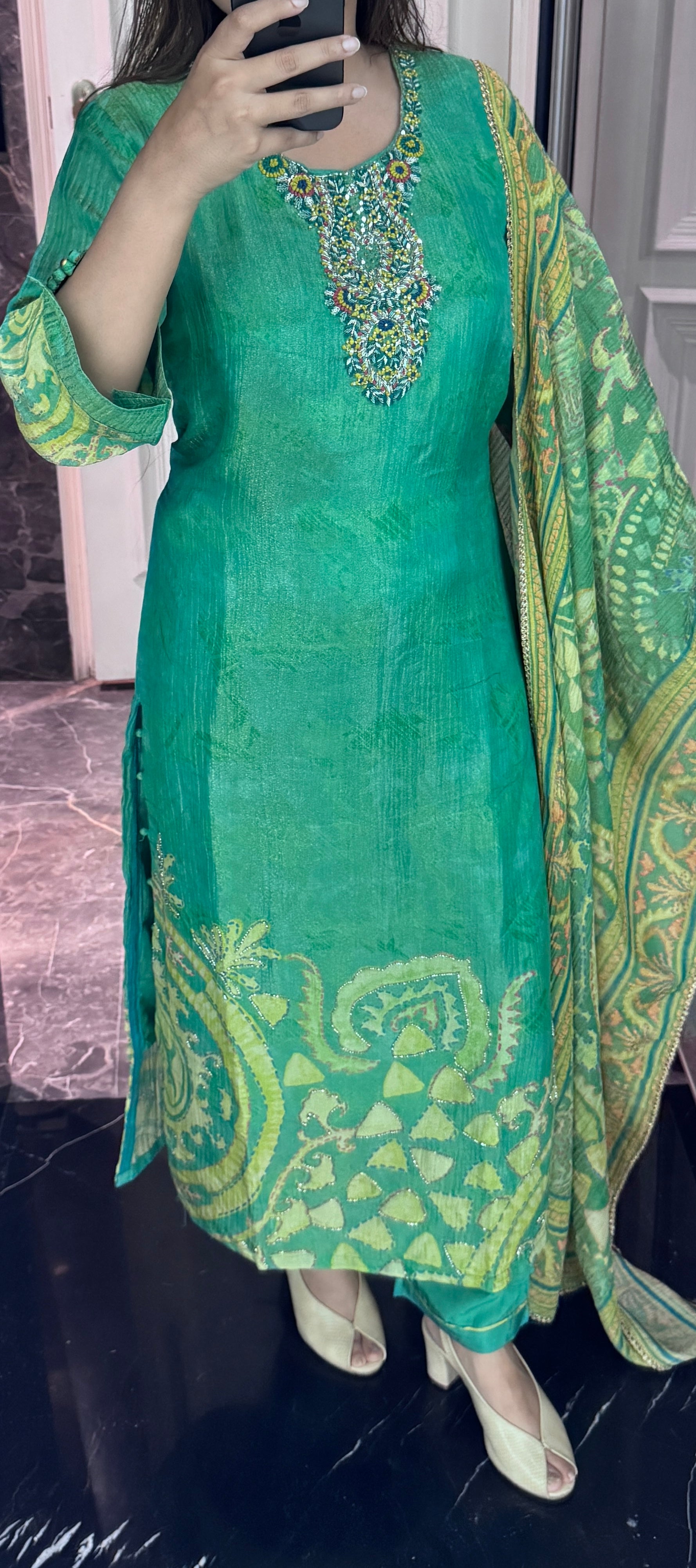 Elevate your festive wardrobe with this exquisite crush tissue green suit, featuring intricate heavy handwork that adds a touch of elegance. The suit comes with an attached lining for comfort, paired with breathable cotton pants and a matching crush tissue dupatta. Designed for special occasions, this ensemble combines traditional craftsmanship with refined style.