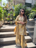 Elevate your presence with the Golden tissue Sharara Suit, an exquisite ensemble that intertwines opulence and sophistication. Adorned with intricate cut glass work and delicate thread embroidery, the two-tone design captures the essence of festivity and elegance, ensuring you radiate a regal charm at weddings and special occasions.