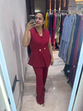 Elevate your wardrobe with the Jenni coord set, an exquisite ensemble that harmoniously merges sophistication with contemporary allure. The structured v-neckline and lapel detailing of the blazer-inspired top embody an air of refinement, while the striking gold buttons evoke a sense of bold elegance. Crafted from a luxuriously smooth fabric, the set drapes gently, ensuring an effortless grace that transitions seamlessly from office meetings to refined gatherings. The matching pants enhance this curated aesthetic, making it an ideal choice for those who appreciate the subtleties of style.