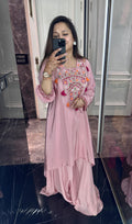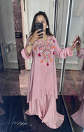 Elegant kaftan crafted from crepe fabric, adorned with intricate hand-worked detailing throughout. Paired with matching sharara pants for a complete, sophisticated ensemble. Perfect for festive occasions and celebrations, this traditional silhouette combines comfort with timeless style. The detailed embellishments showcase skilled craftsmanship, making it an ideal choice for those seeking refined, statement-making pieces.