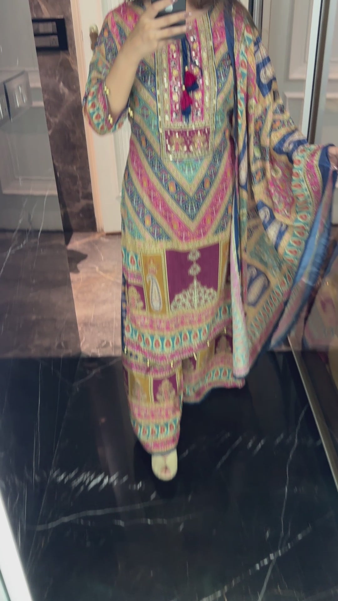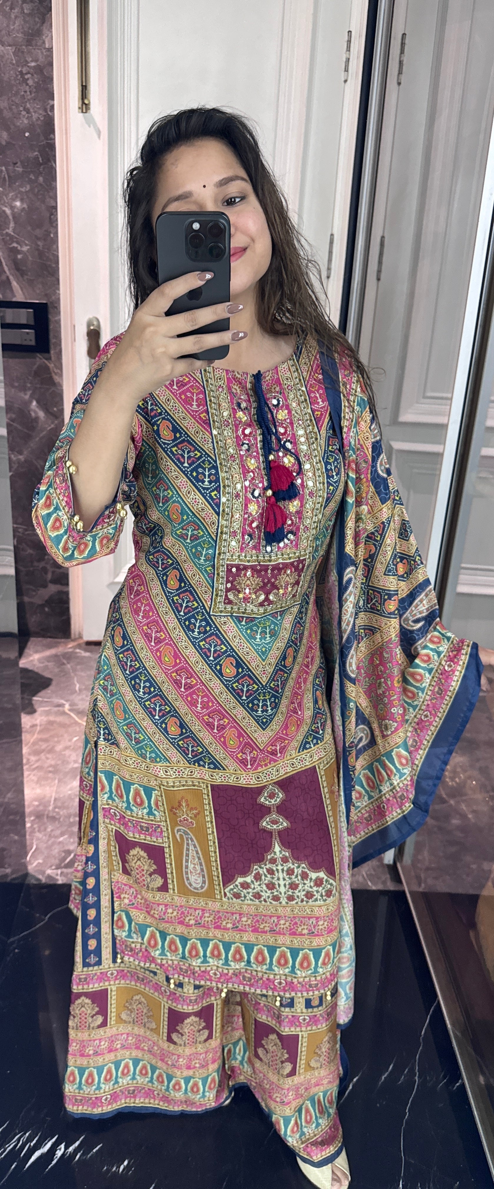 This Patola palazzo suit features elegant chinon fabric adorned with intricate patola print and delicate handwork detailing. Lined with soft mul cotton for comfort, it pairs beautifully with wide-leg palazzo pants and a matching chinon dupatta. Ideal for festive occasions like Rakhi and Diwali, this ensemble offers a refined and graceful look that blends tradition with contemporary style.