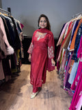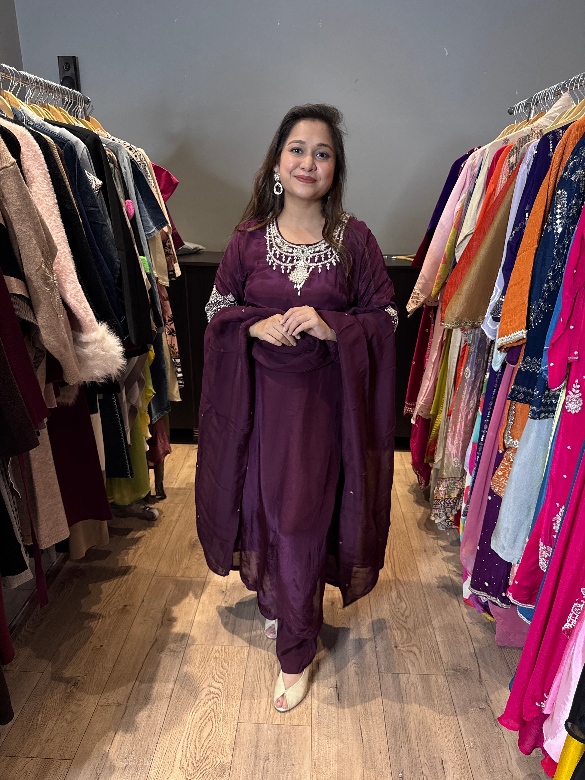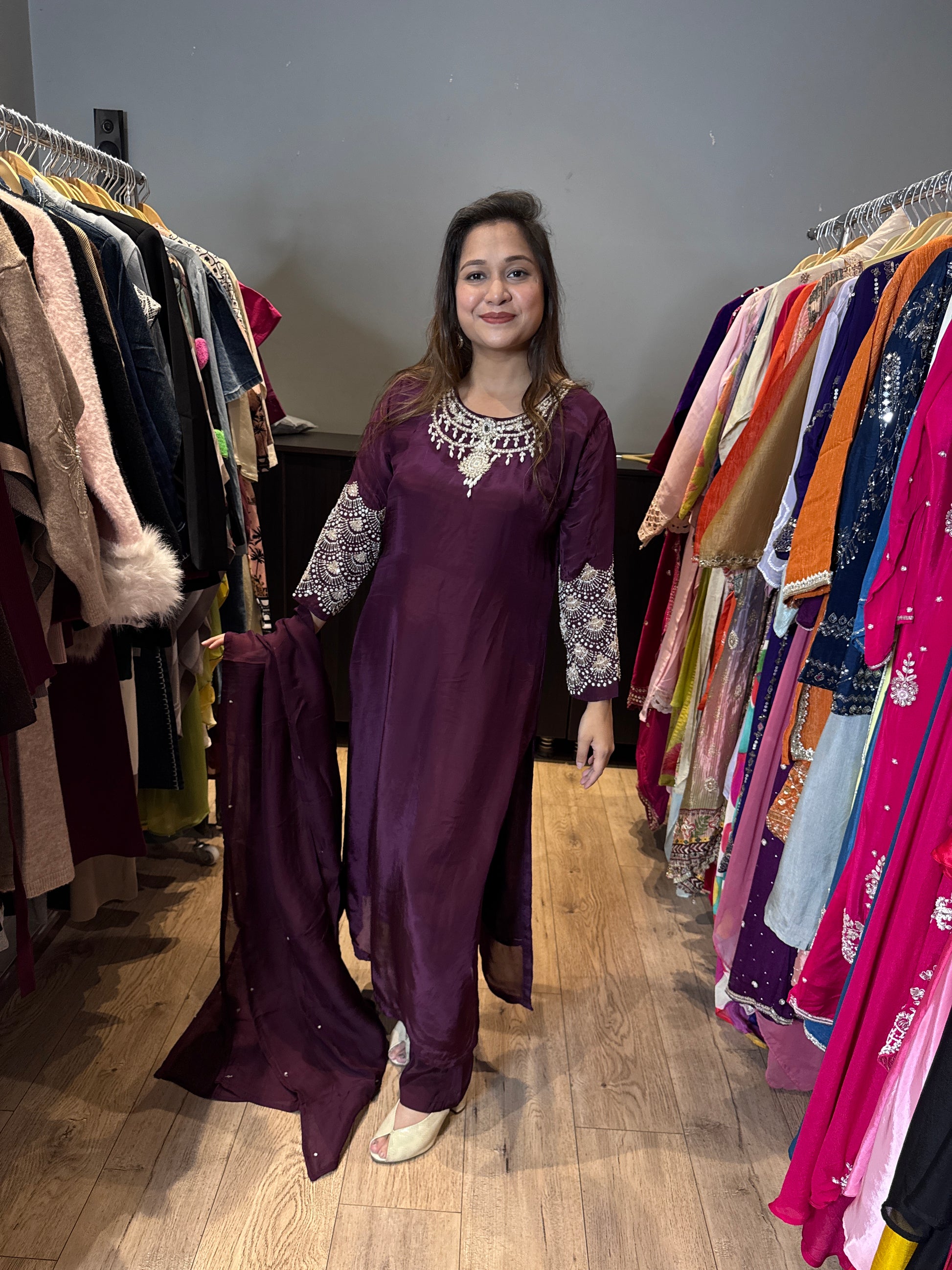 Pearl work detailing pure crepe straight suit with heavy pearl detailing on neck and sleeves, comes with lining and crepe pants long with organza pearl dupatta.