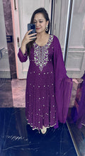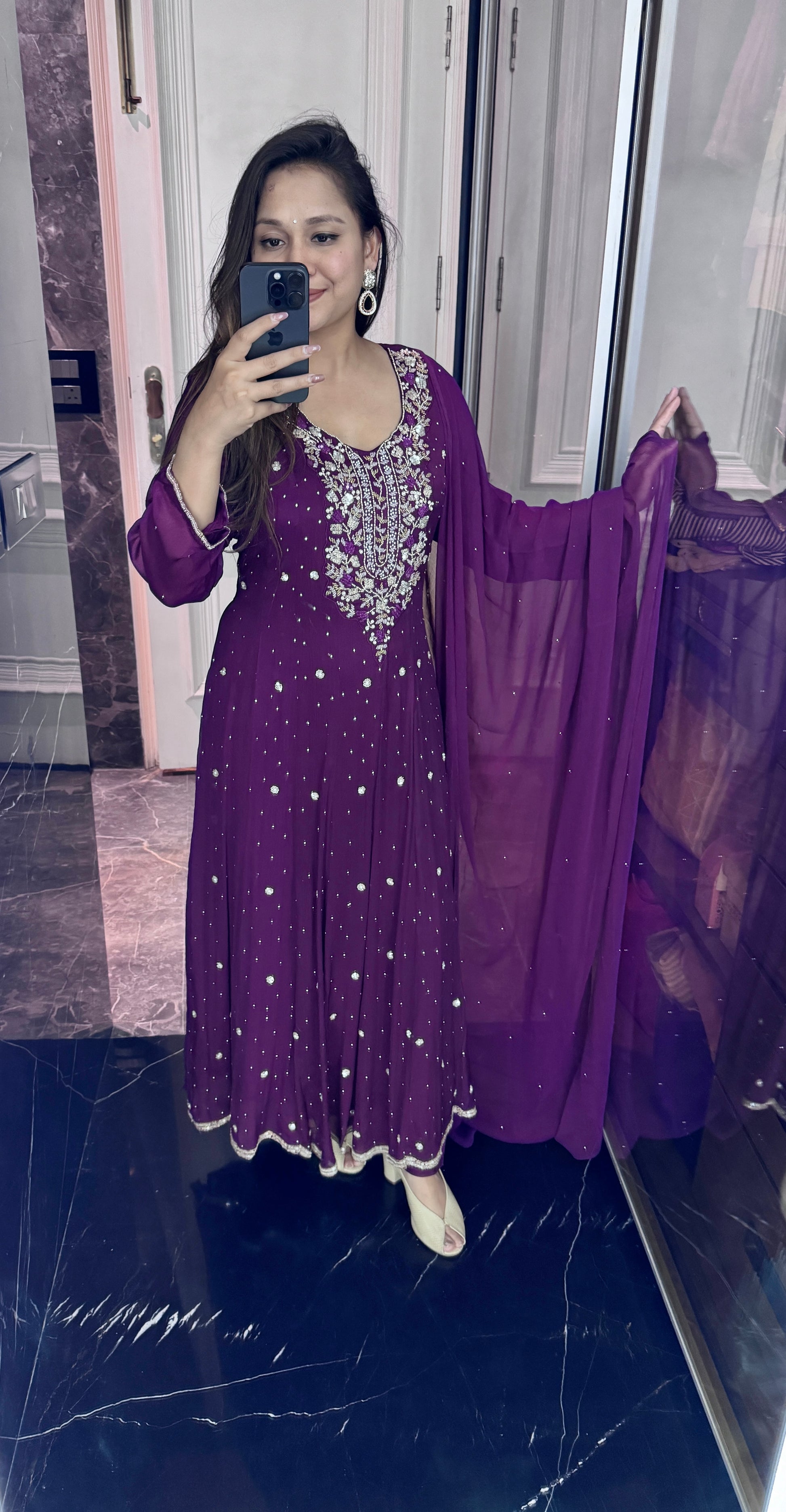 Embrace timeless elegance with this stunning purple Anarkali suit crafted from luxurious chinon fabric. Adorned with intricate hand embroidery, each detail showcases exquisite craftsmanship and artistry. The flowing silhouette flatters every figure while the rich purple hue adds sophistication to your wardrobe. Perfect for weddings, celebrations, or special occasions, this piece combines traditional beauty with contemporary style.