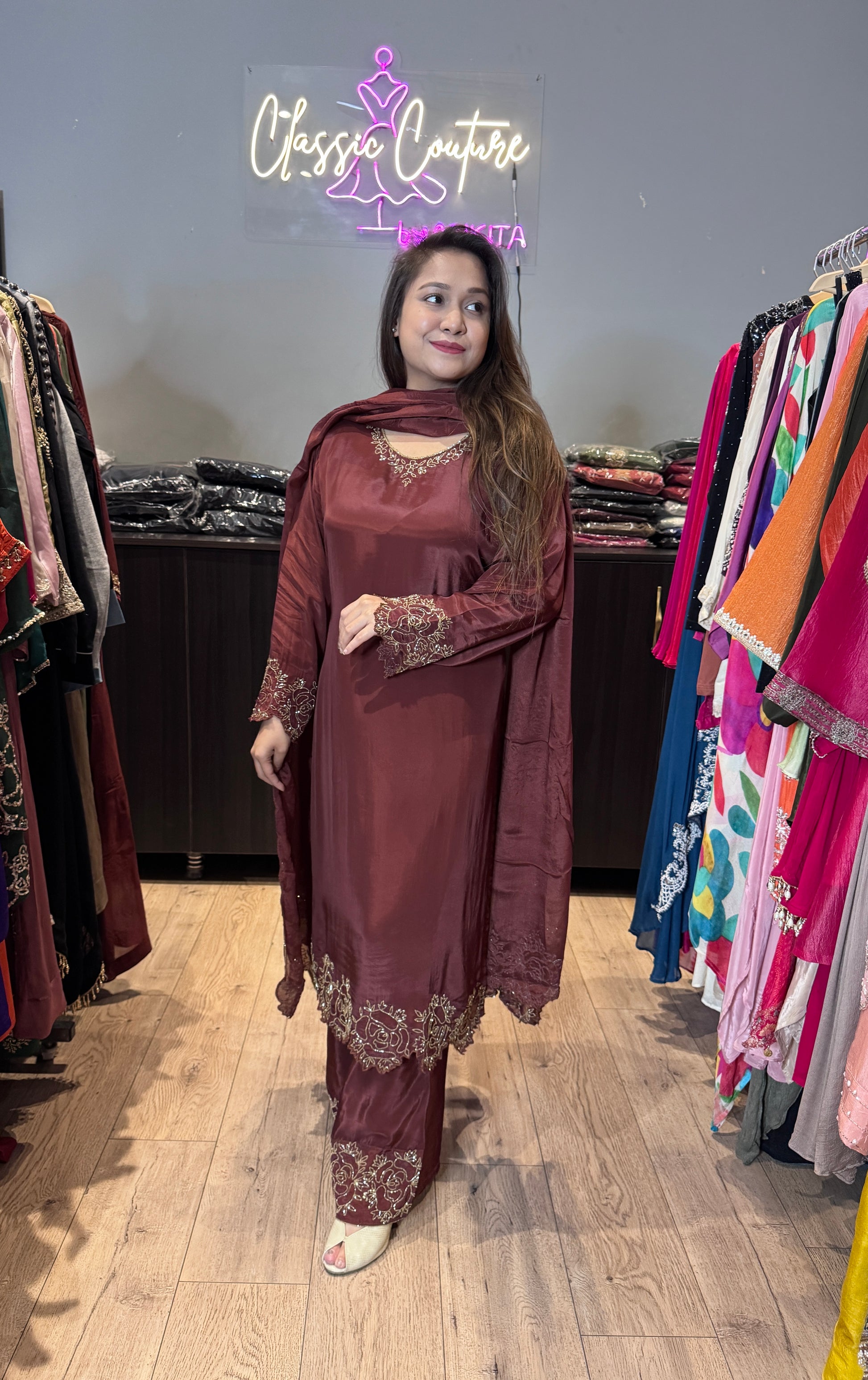 Step into festive glamour with this beautiful pure crepe suit, exquisitely adorned with intricate cut dana hand embroidery. Paired with flowy palazzo pants, the ensemble offers a perfect balance of comfort and sophistication. The highlight is the luxurious organza dupatta, richly embellished with heavy handwork, adding a touch of drama and elegance.