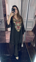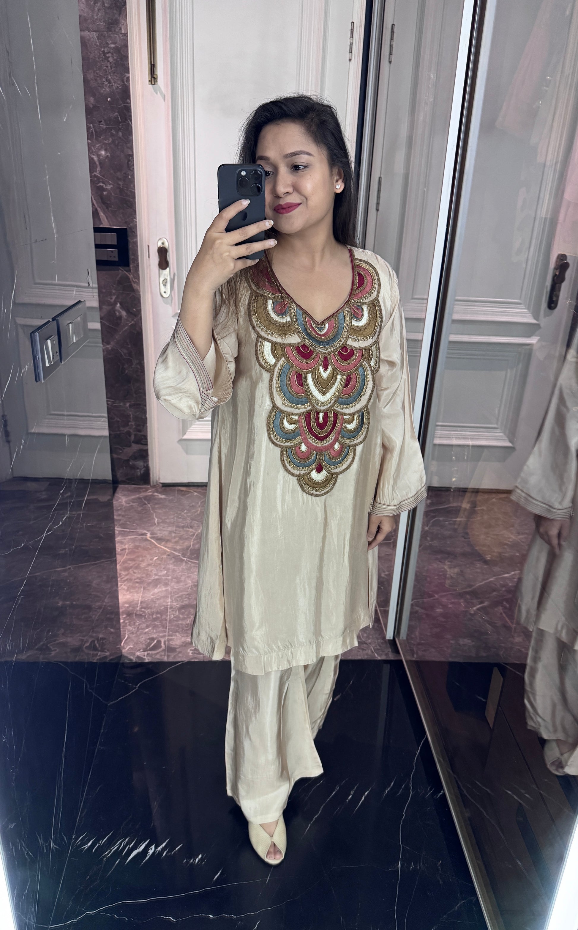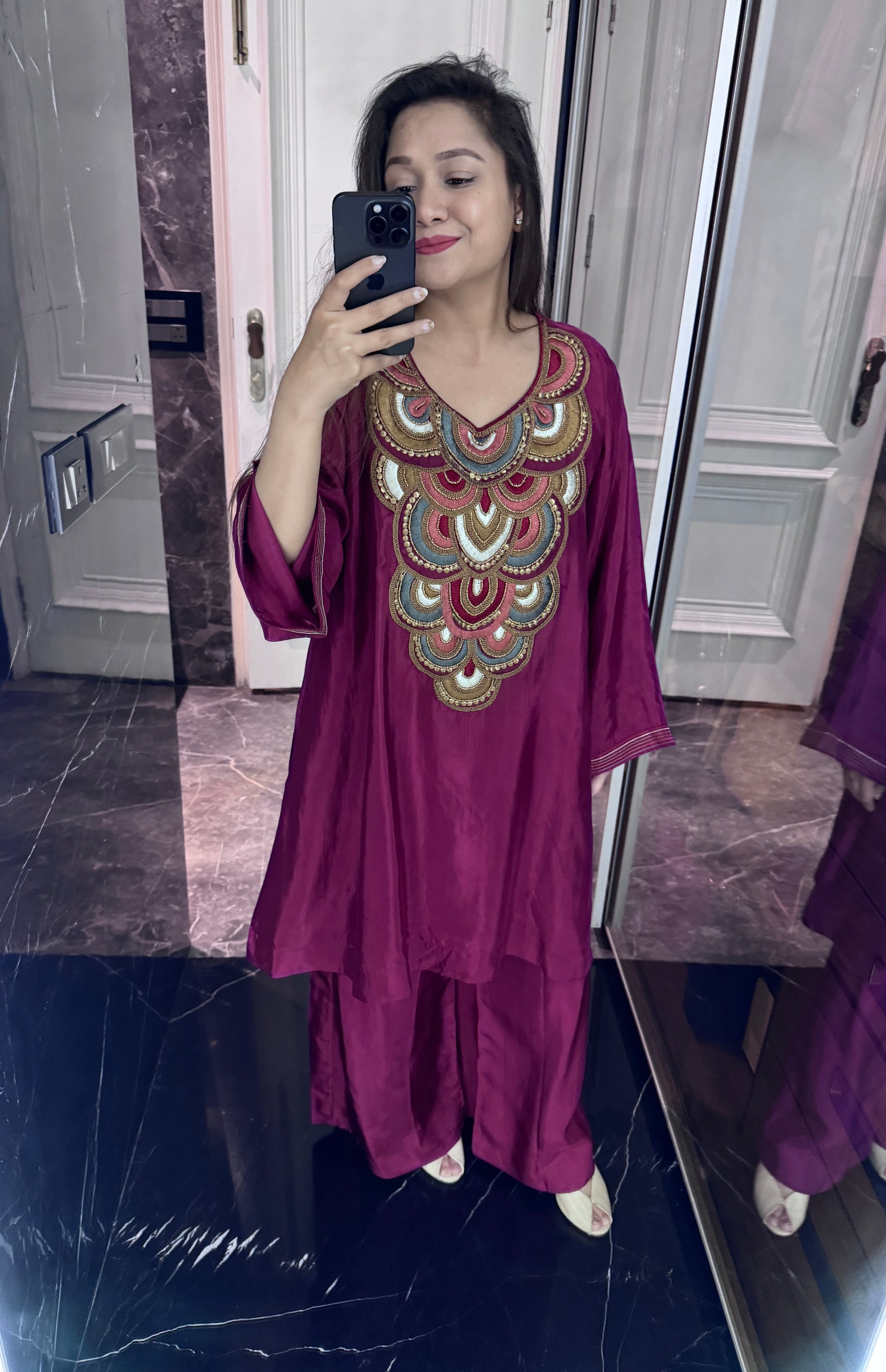 Elevate your festive wardrobe with this elegant pure crepe coord set, beautifully adorned with delicate pearl sequin hand embroidery. Designed in a gorgeous, flattering silhouette, this ensemble effortlessly blends comfort with glamour. Lightweight, graceful, and effortlessly chic, this coord set is perfect for making a stylish statement with ease.