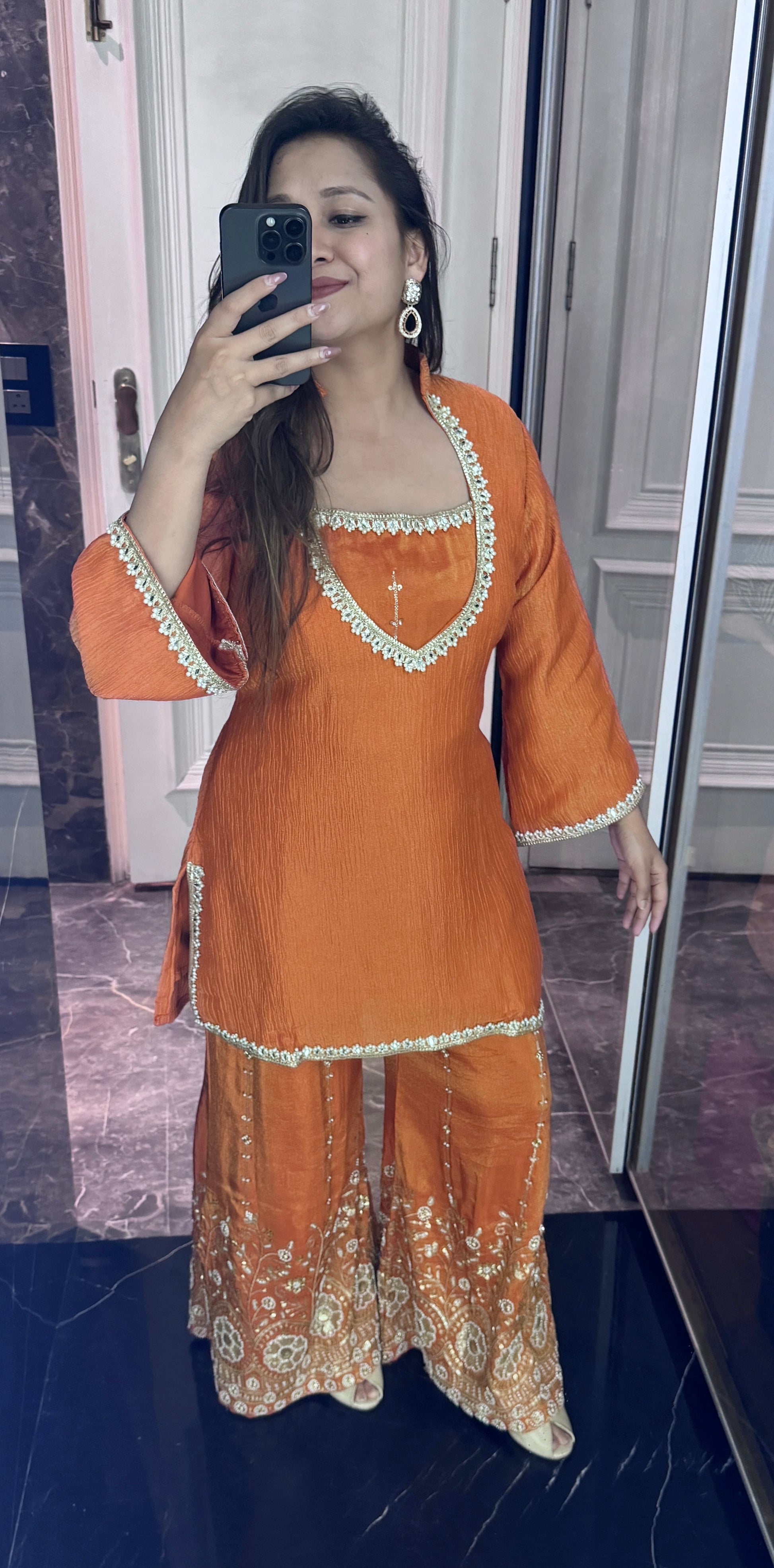 Elevate your festive celebrations with this exquisite sharara suit, a timeless piece of Indian couture. Crafted with meticulous attention to detail, this ensemble features elaborate hand embroidery that showcases traditional artistry. The flowing silhouette of the sharara paired with an intricately embellished kurta creates an effortlessly graceful look. Perfect for weddings, festivals, and special occasions, this sophisticated design blends heritage craftsmanship with contemporary elegance. Drape yourself in luxury and make a striking impression at every gathering.