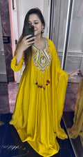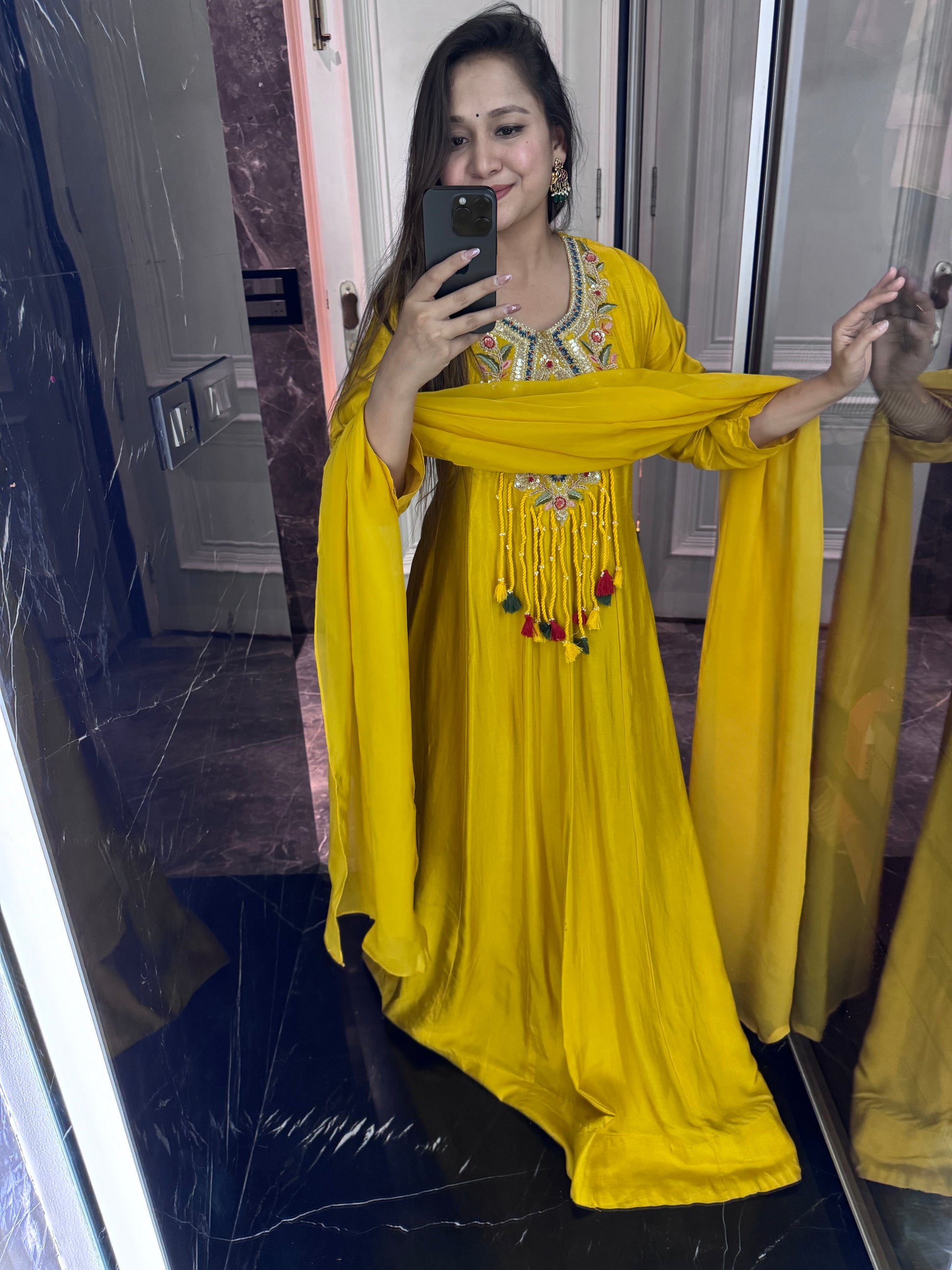 Elevate your ethnic wardrobe with this stunning yellow Anarkali suit, crafted with intricate silk hand work and delicate tassel detailing. The flowing silhouette flatters all body types, while the organza dupatta adds an ethereal grace to your ensemble. Perfect for weddings, festivals, and special celebrations, this piece combines traditional craftsmanship with timeless elegance.